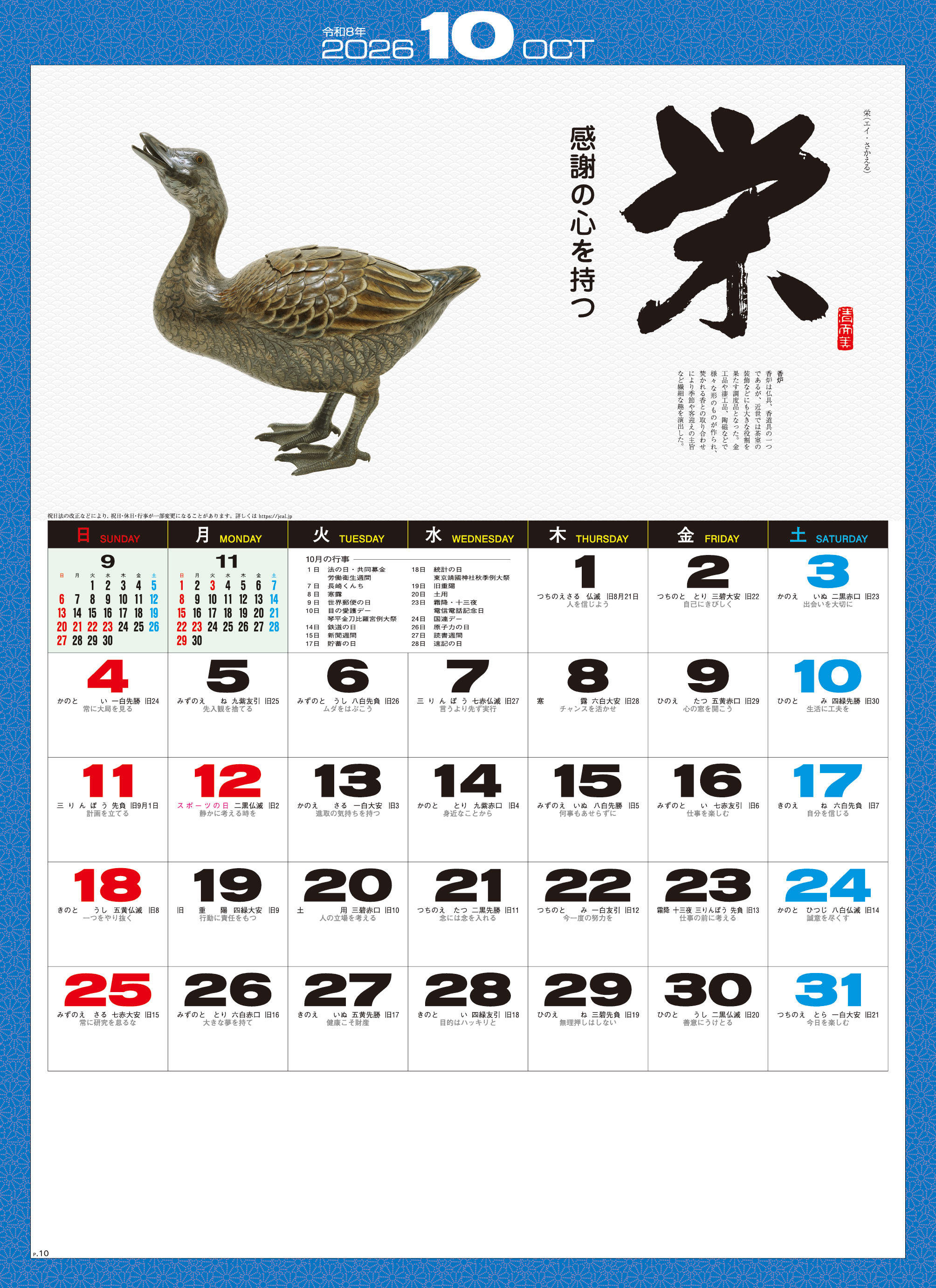 ※暮らしに役立つ格言入りです。 ※前後月も入り大変便利です。 ※六曜、旧暦、主要行事入りです。 |