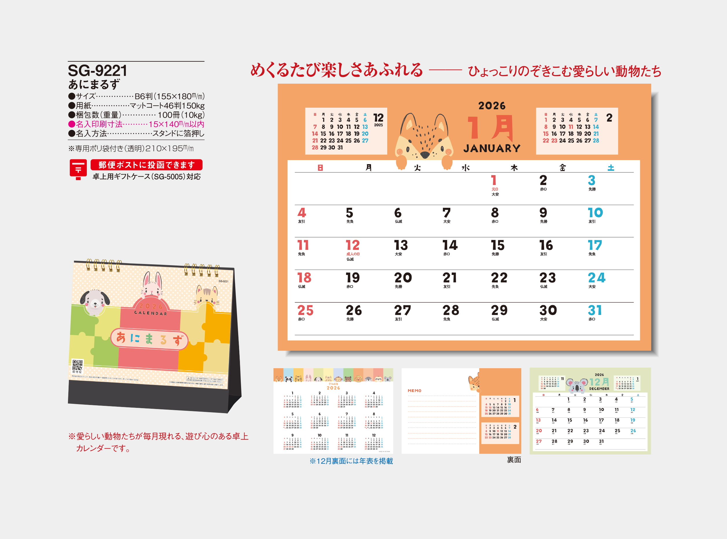 記載金額には、卓上カレンダー本体・箔押し印刷代・版代・送料(一括納入、沖縄・北海道、一部地域を除く)が含まれます。