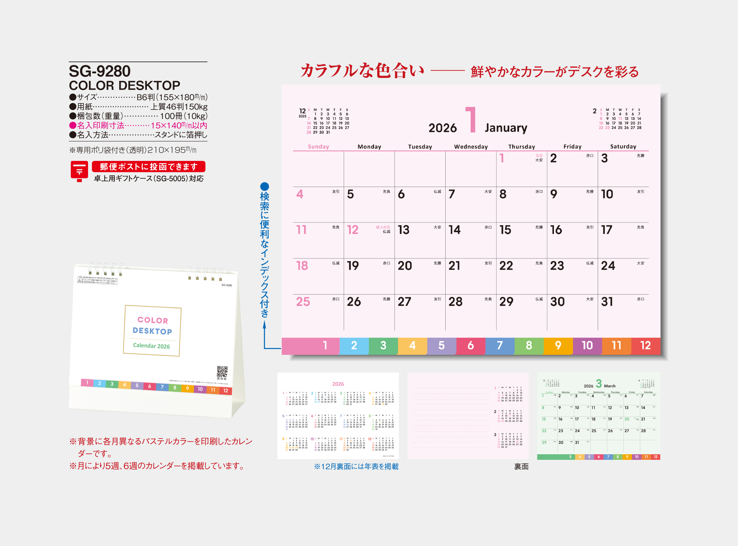 記載金額には、卓上カレンダー本体・箔押し印刷代・版代・送料(一括納入、沖縄・北海道、一部地域を除く)が含まれます。