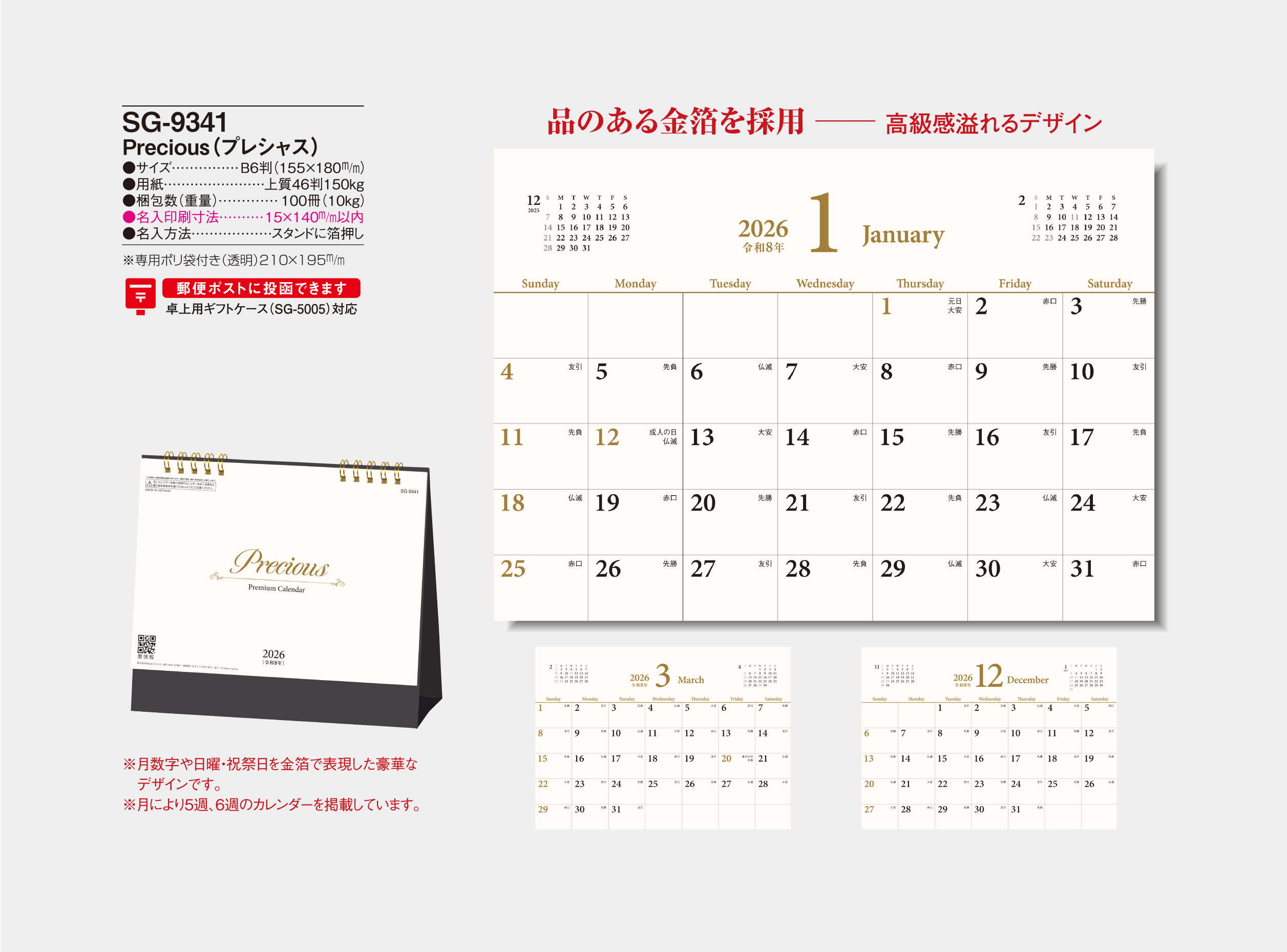 記載金額には、卓上カレンダー本体・箔押し印刷代・版代・送料(一括納入、沖縄・北海道、一部地域を除く)が含まれます。