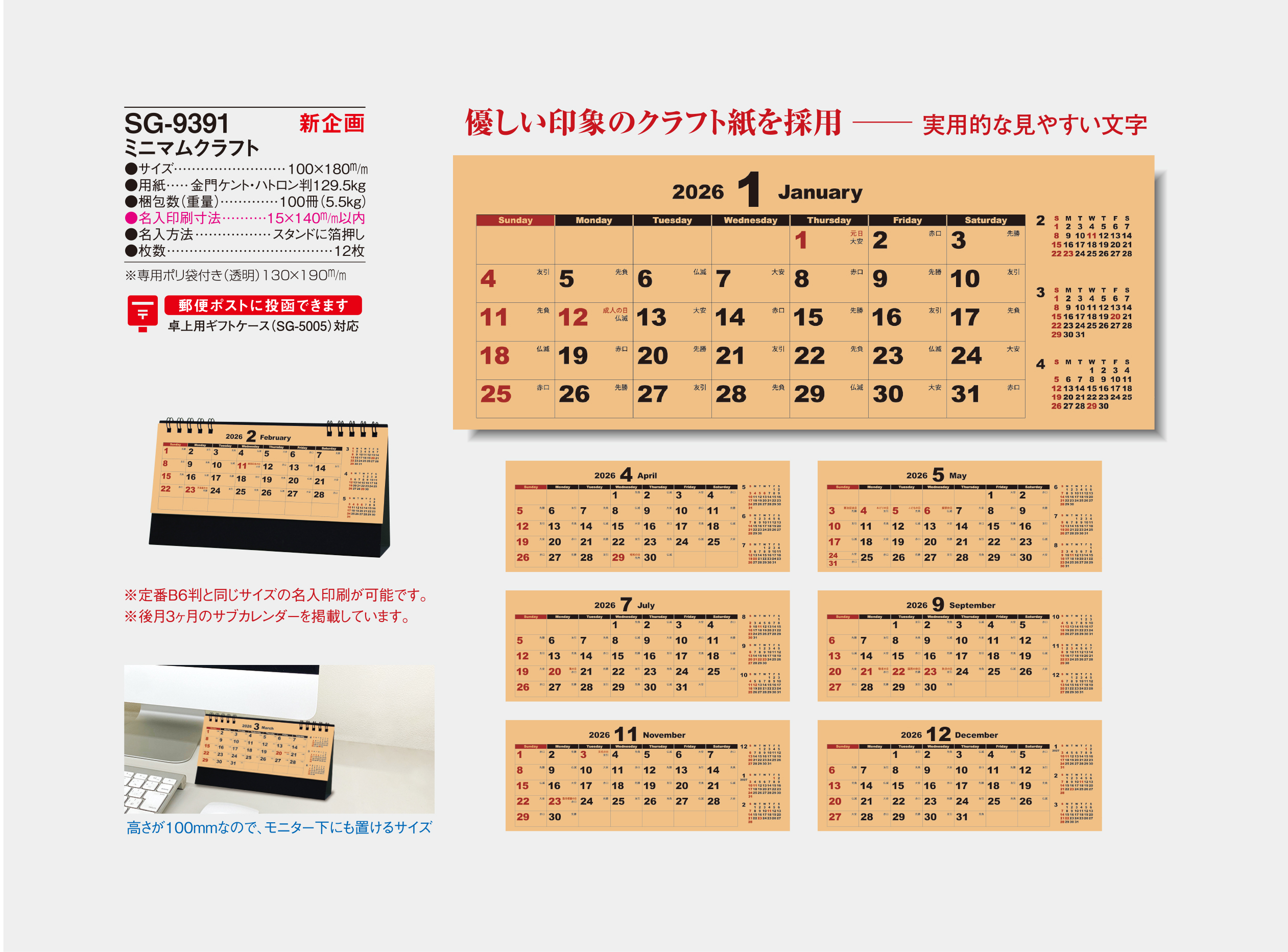 - 記載金額には、卓上カレンダー本体・箔押し印刷代・版代・送料(一括納入、沖縄・北海道、一部地域を除く)が含まれます。