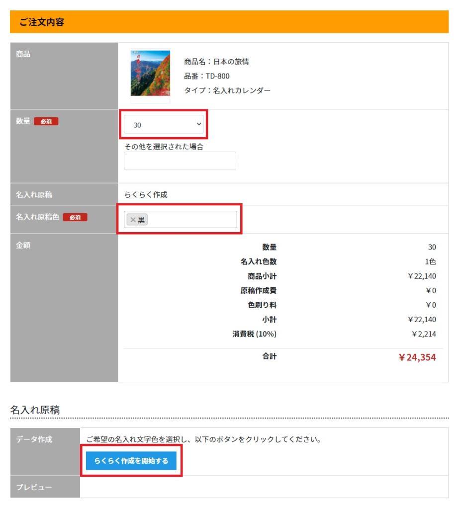 2. 数量・色を選択し、「らくらく作成を開始する」をクリックします。